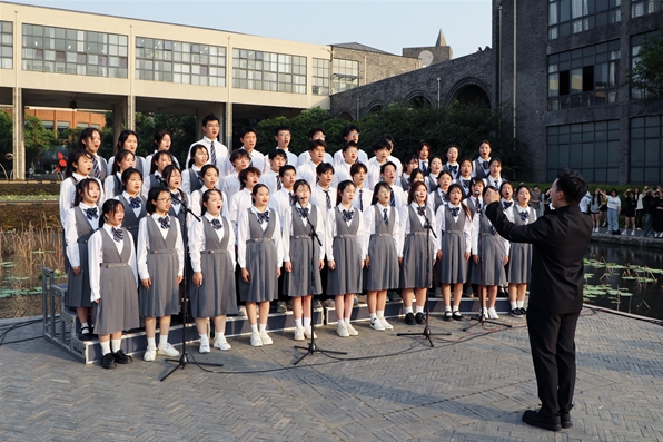 与往年不同的是,今年的合唱比赛首次将室内演唱改为室外竞演,九支合唱队从图书馆唱到荷花池,从教学楼唱到人工湖,他们把学校建筑连廊、中庭花园,以及花木藤萝等作为演绎背景,观众们则像游园一样,一边欣赏校园美景,一边跟随合唱队倾听美好音乐,为观众们送上了一场别开生面的视听盛宴。